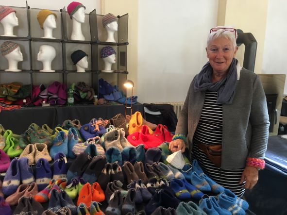 So gestaltet Holzkünstler Thorsten Herpers aus Löf alte Eichenbalken. Durch seine Schnitzkunst erweckt er das Holz eindrucksvoll zu neuem Leben. Siegfried Arnold aus Oberfell bearbeitet angelandetes Treibholz, indem er es nach zwei Jahren Trocknungszeit glatt schleift und zu Skulpturen aufbereitet. Und Mechthilde Flacke (geb. Ibald) präsentierte einem interessierten Publikum ihre wundervollen Handarbeiten für Kopf und Füße aus Wolle in ihrem alten Heimatort Hatzenport. Im ehemaligen Probierkeller vom Paulys konnte man sich über die Akademie der Kleidermacher von Brigitte Pappe aus Moselkern informieren und zu Nähkursen beraten lassen, außerdem beeindruckende Schwarz-Weiß-Fotografien besichtigen. Natalie und Georg aus Kattenes bereicherten den Markt mit der alten Technik des Linolschnittes.